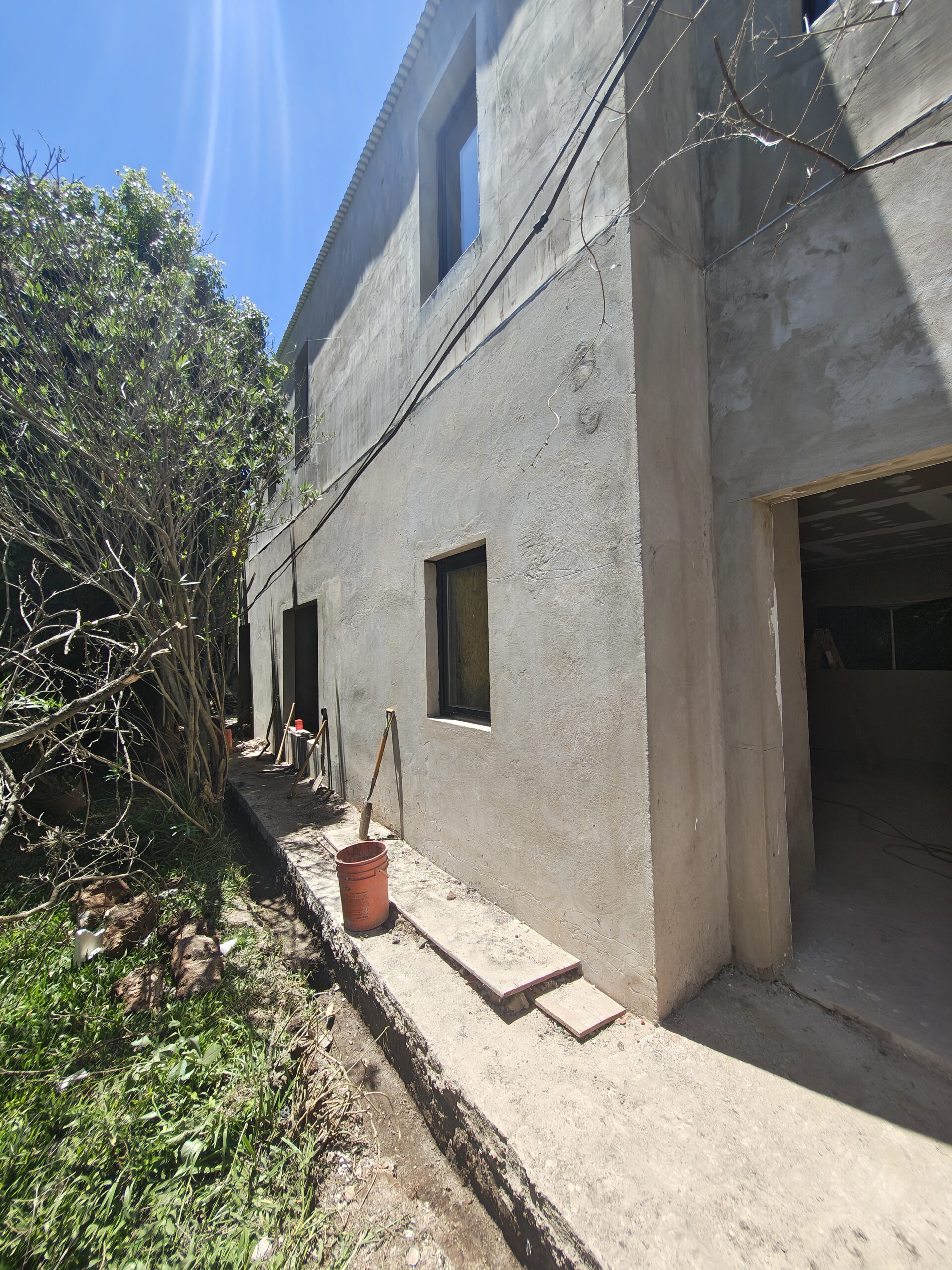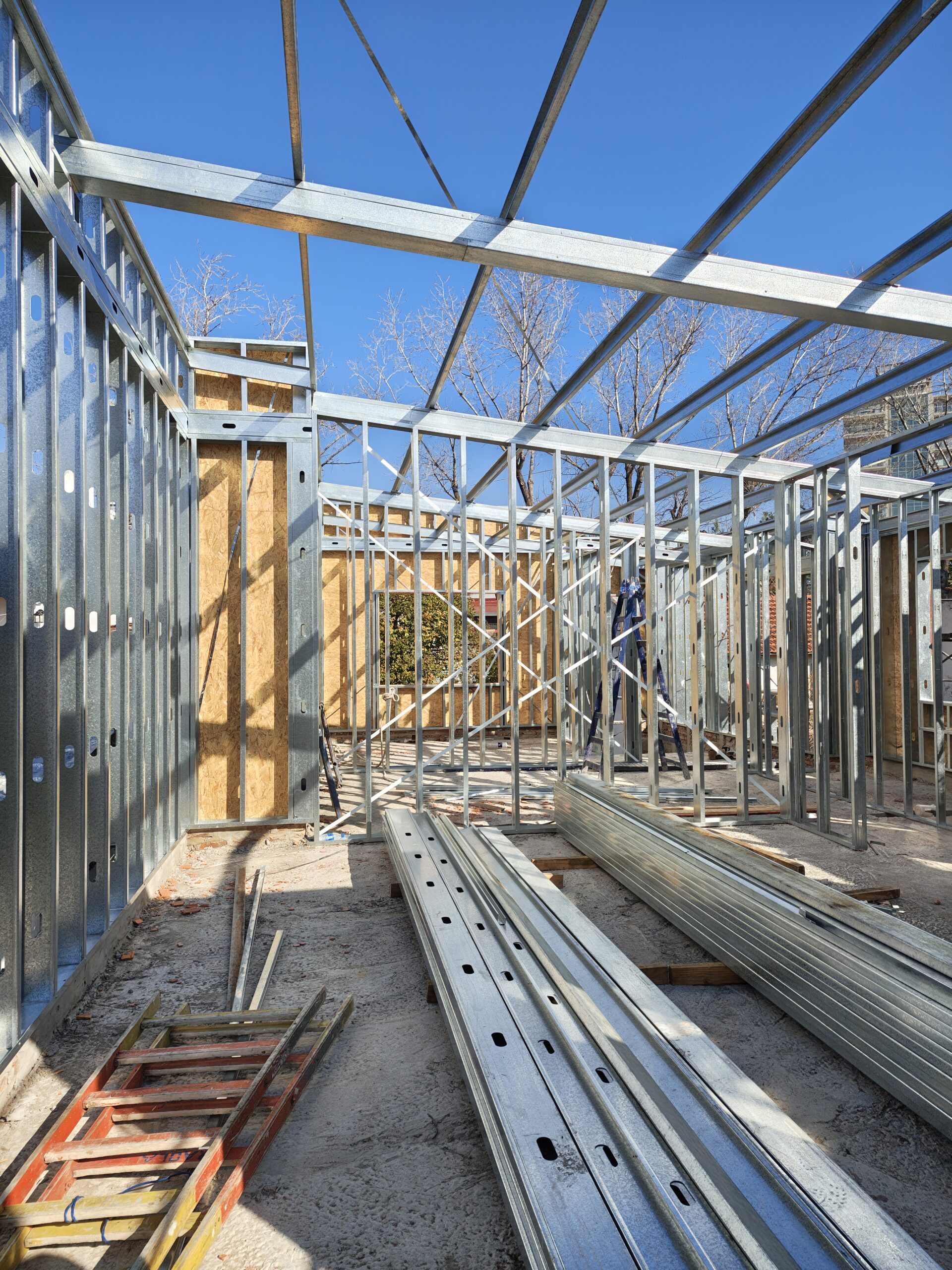 - Provisión y colocación de estructuras en perfiles galvanizados, paredes exteriores, tabiques interiores y cielorrasos en placas de roca de yeso.
